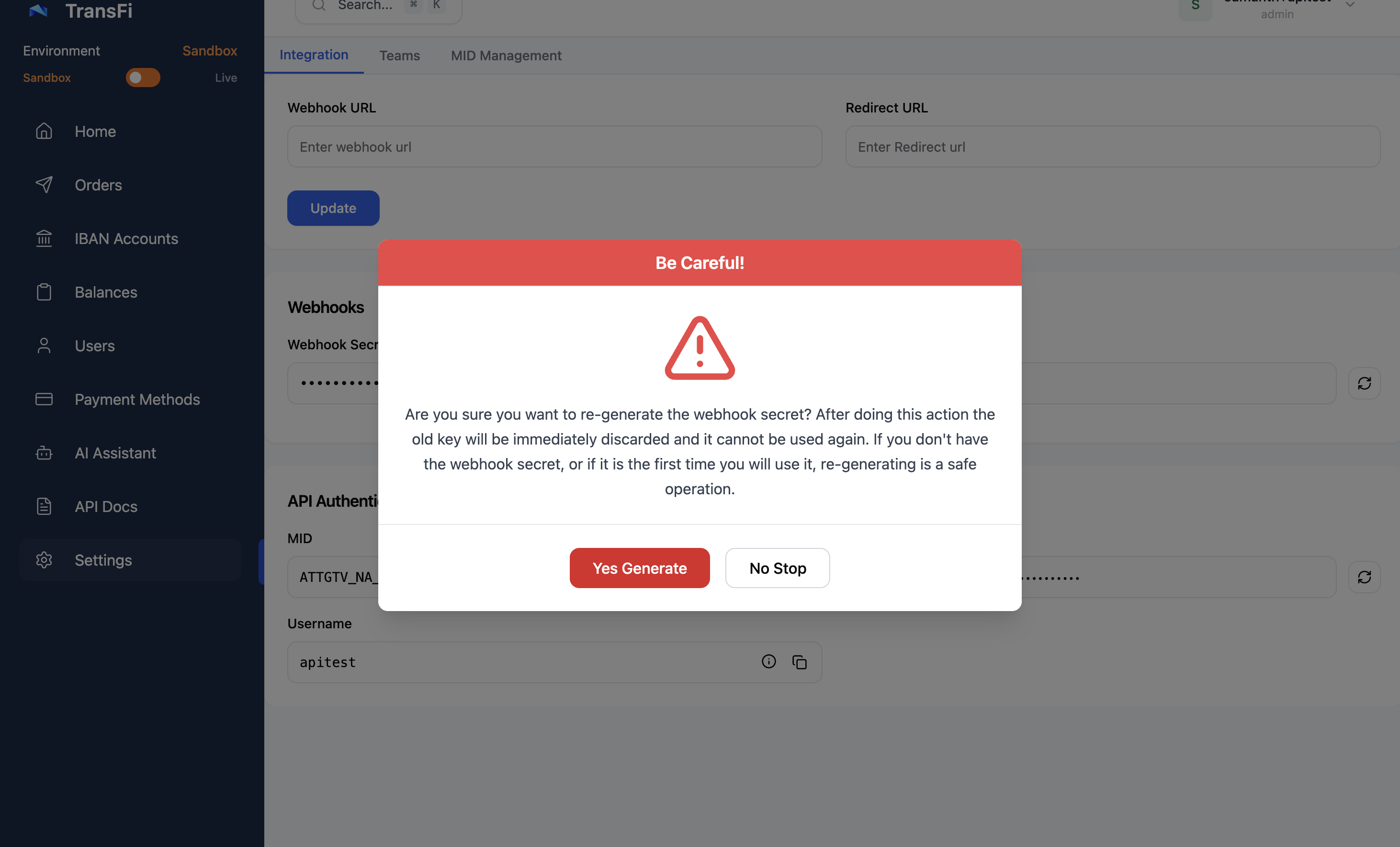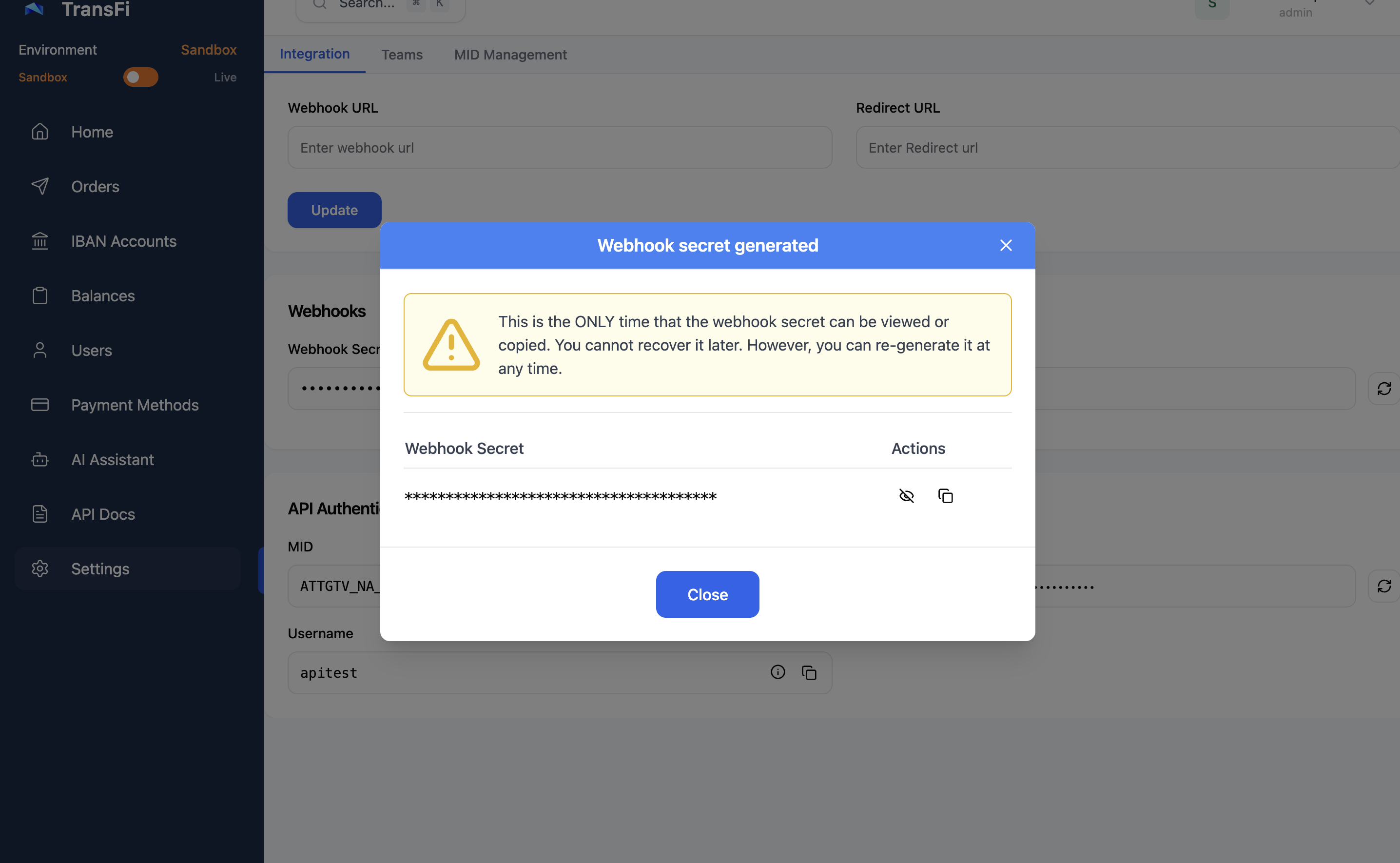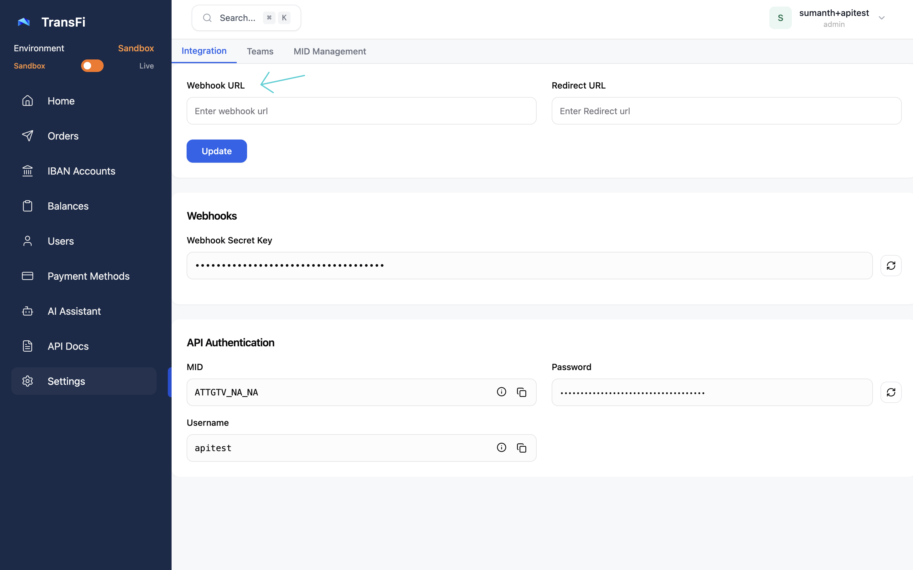 To configure your webhook listener, you can specify your Webhook URL and access the Webhook secret key in the settings section and Integration tab of the TransFi customer platform.