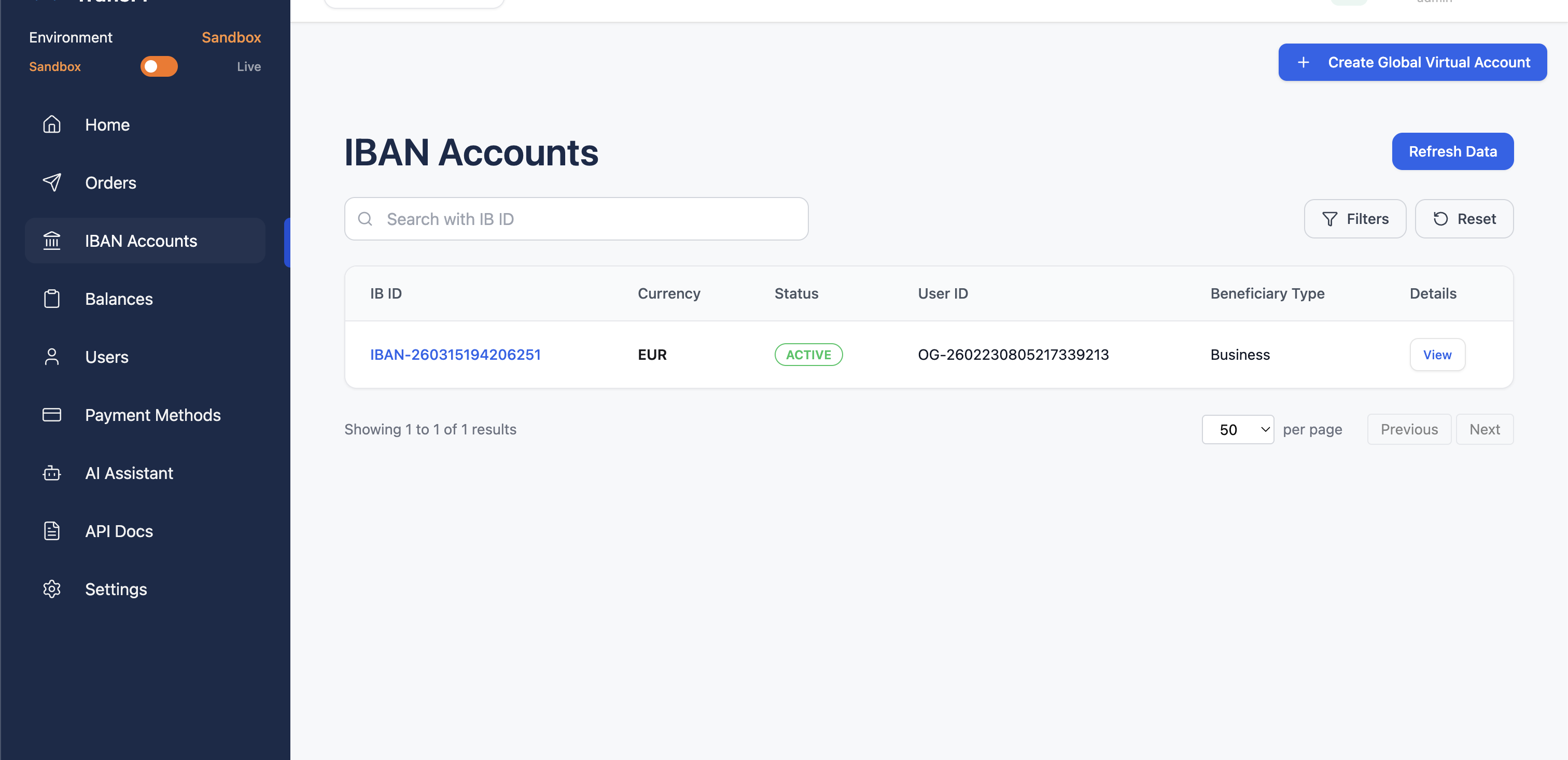 You can manage your IBANs either directly through the TransFi Dashboard UI or programmatically via our API.