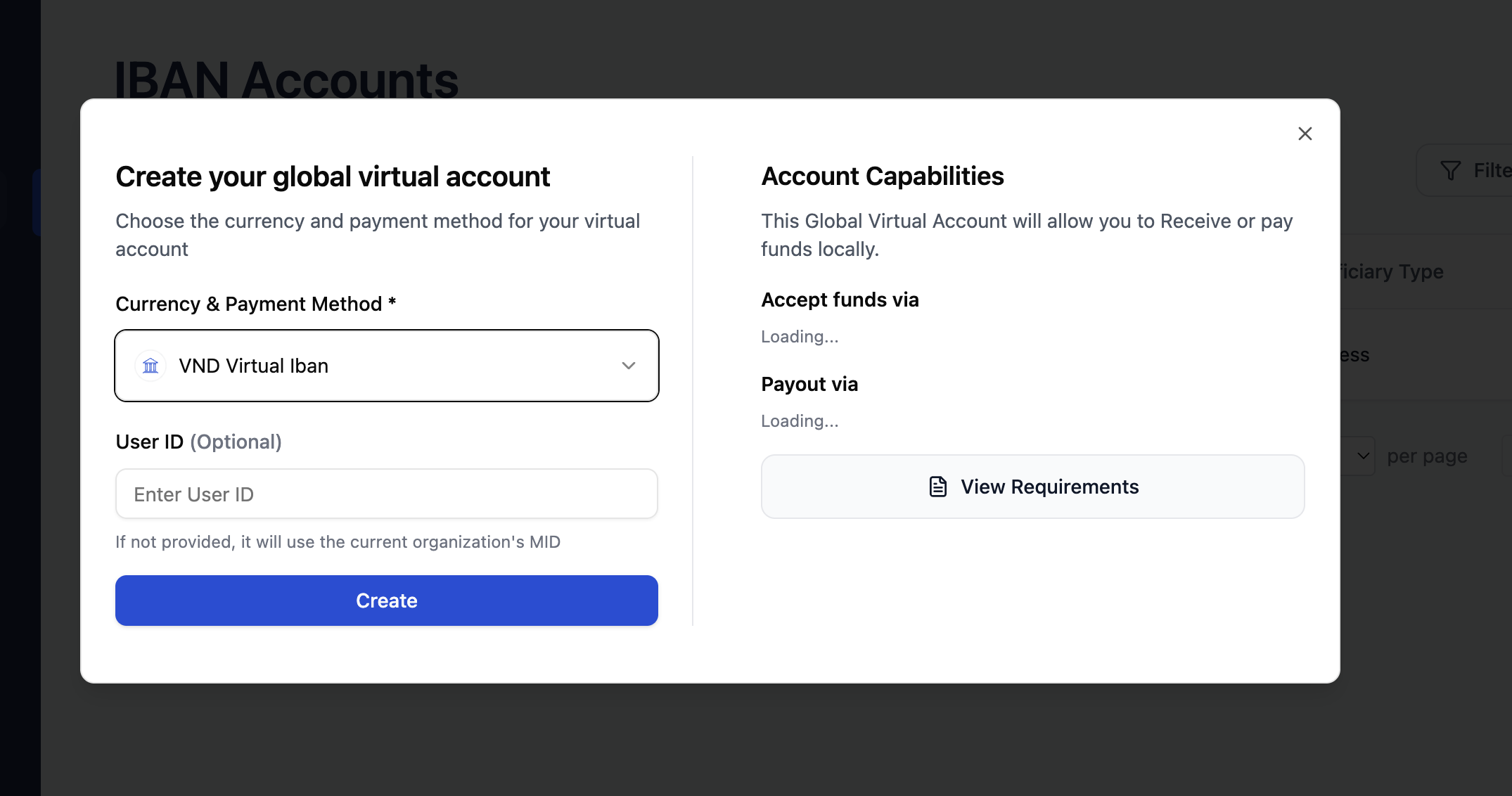 Before creating an IBAN, you may want to verify the supported payment methods and partner banking rails available for your target currency and beneficiary type.